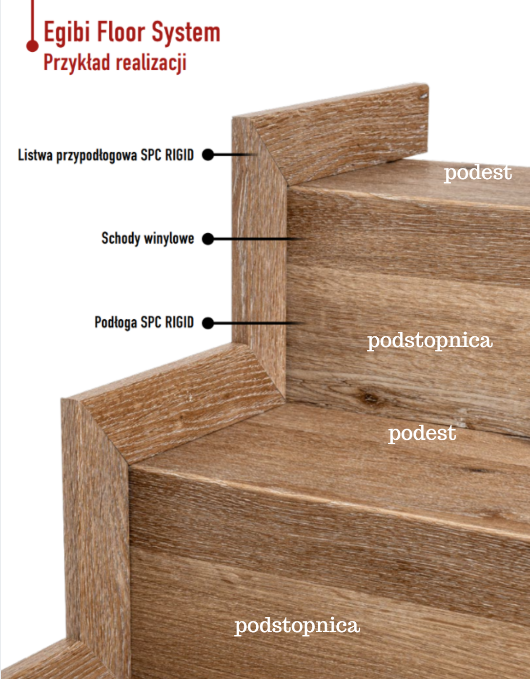 Stopnica, krawędź winylowa i panel bazowy w identycznym dekorze SPC RIGID. Konfigurator dobiera wszystkie elementy automatycznie.